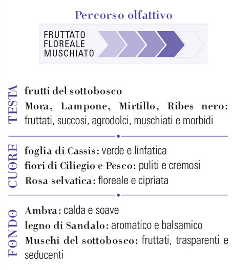 Il cuore svela un'anima più morbida e sofisticata, mentre il fondo di Muschio Bianco dona quella sensazione di "pelle pulita" e una persistenza rassicurante che dura per tutta la giornata.