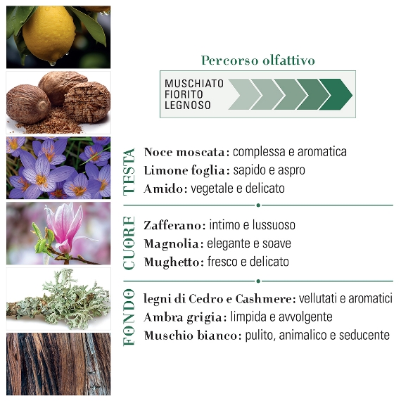 Note: Un mix che include Noce Moscata e Foglia di Limone in apertura, note fiorite (Magnolia, Mughetto) nel cuore, e un fondo avvolgente con Legno di Cashmere, Ambra Grigia e, ovviamente, Muschio Bianco.