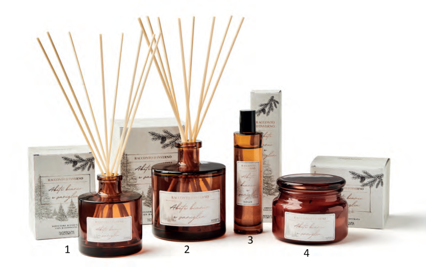 La nota resinata dell’abete bianco vestito a festa, si amalgama dolcemente al tocco gourmand della vaniglia dei dolci festivi e a quel lieve sentore di legna che arde nel caminetto acceso.