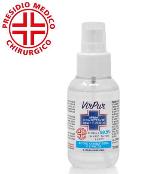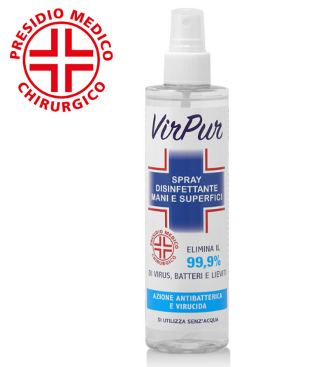 Virpur Spray Disinfettante Mani e Superfici è una soluzione alcolica disinfettante per le mani con attività battericida, lieviticida, virucida limitata dopo un minuto di contatto, e per le superfici con attività battericida, lieviticida, virucida completa dopo 5 minuti di contatto.